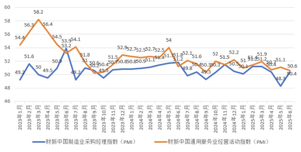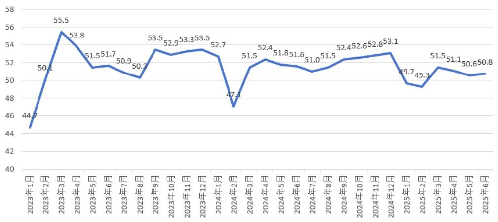 2025年6月,财新中国制造业采购经理指数(PMI)为50.4%,比5月上升2.1个百分点。