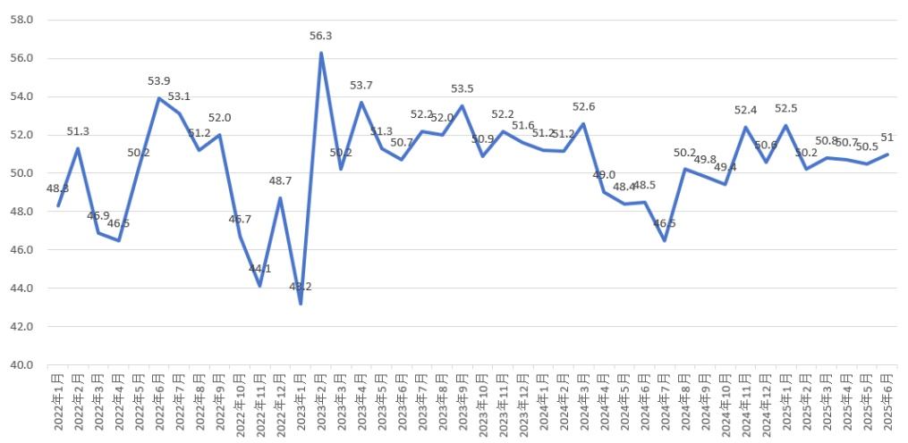 2025年6月,中国仓储指数为51.0%,比5月上升0.5个百分点(见图5)。