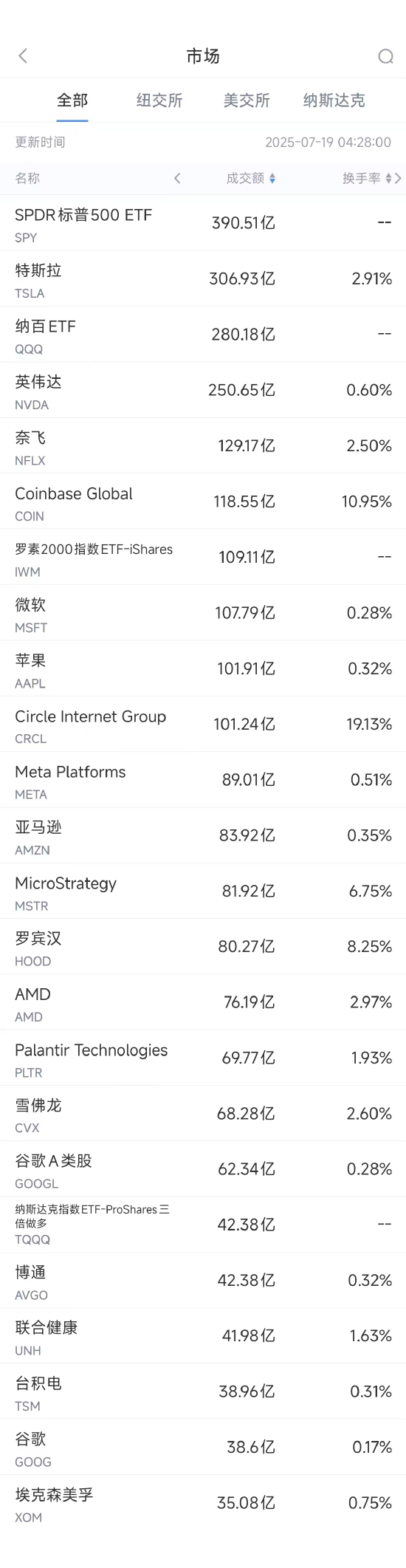 第3名Netflix收跌5.10%,成交129.17亿美元。该公司第二季度财报超出预期,且上调了全年营收展望,但这仍未能打动投资者。周五该股收跌逾5%,原因主要是其业绩未能达到报告发布前市场设定的高门槛。
