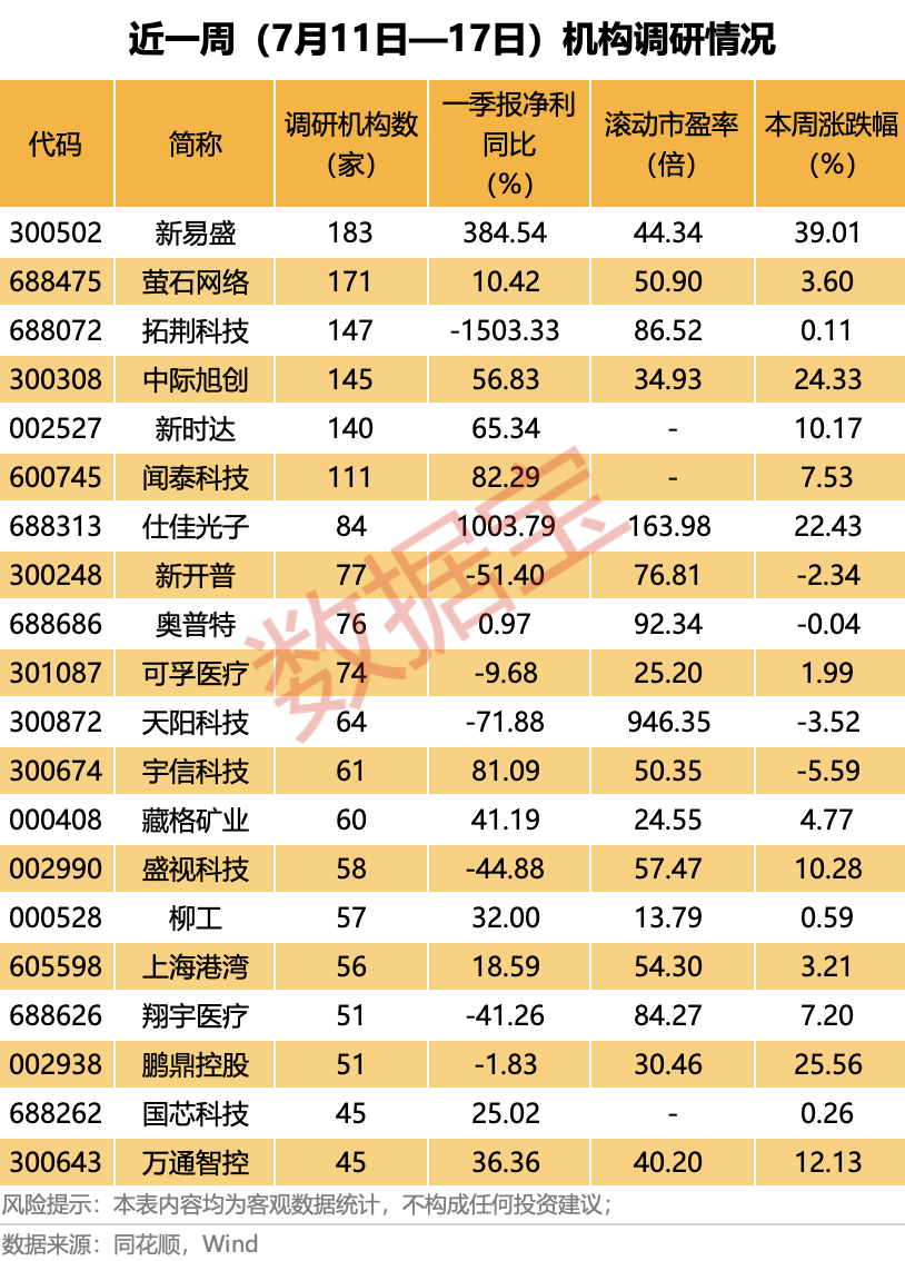 新易盛近一周合计有183家机构调研,其中包括64家基金公司、13家证券公司、17家阳光私募、14家保险机构等。