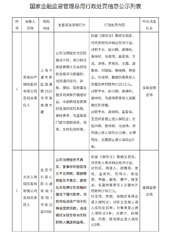 6月13日,金融监管总局披露的罚单显示,天安人寿保险股份有限公司因公司治理报告不真实,董事尽职报告存在不实声明,薪酬管理报告不真实,高管在未取得任职资格的情况下履行职责,违规将投资资产用于担保或提供贷款,违规通过关联交易向实际控制人输送利益等被吊销业务许可证。同时,刘征、周猎人、胡春岚、姜凯、孟宪利、陈祥义、张连庆、李磊、解彤、唐宁、陈玉龙、朱翼炜等责任人员,被警告并罚款共计99万元;王伟、吉喆、张璐被终身禁止进入保险业;陈玉龙被禁止进入保险业10年;崔勇被禁止进入保险业5年;唐宁、赵晓强、刘勇、陈颀被禁止进入保险业3年。