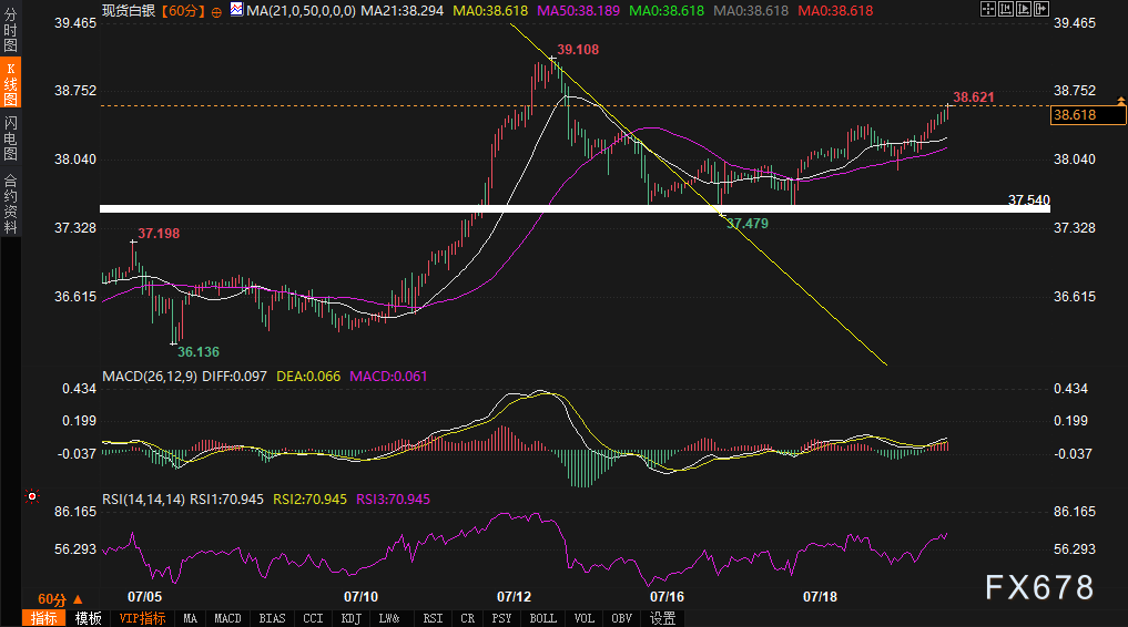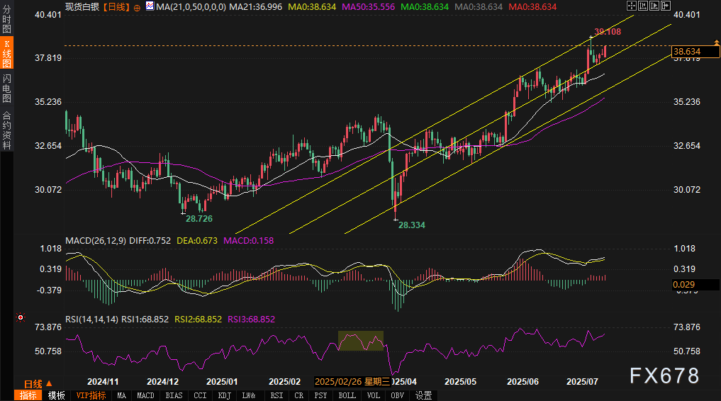 汇通财经APP讯――周一(7月21日),现货白银(XAG/USD)在经历上周温和回调后,展现出企稳回升的态势。截至北京时间晚间,银价交投于38.50美元附近,逼近7月14日创下的多年高点39.13美元。尽管近期涨势略显疲态,但技术指标重新转强,叠加美元走软和避险情绪的支撑,短期内银价仍维持看涨倾向。本文将结合最新报价和市场动态,从基本面和技术面视角深入剖析银价走势,并展望未来趋势。