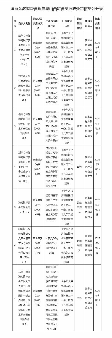 具体来看,渤海银行股份有限公司太原分行因授信调查不尽职、员工行为管理不到位、流动资金贷款管理不尽职,被罚款95万元。渤海银行股份有限公司太原幸福里支行(原渤海银行股份有限公司太原亲贤支行)因未真实反映风险状况、贷后管理不到位,被罚款70万元。