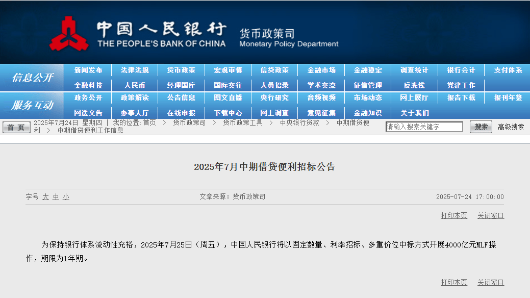 为保持银行体系流动性充裕,中国人民银行(以下简称“央行”)7月24日发布公告称,7月25日央行将以固定数量、利率招标、多重价位中标方式开展4000亿元中期借贷便利(MLF)操作,期限为1年期。鉴于本月有3000亿元MLF到期,本次MLF操作意味着央行在7月MLF净投放1000亿元,为央行连续第五个月对MLF加量续作。