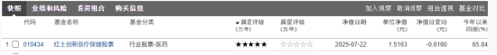 红土创新医疗保健(010434)聚焦医疗健康领域中的创新药及医疗科技,以出海预期及临床阶段重大突破为选股核心逻辑,根据二季度末晨星中国基金评价中心数据,今年以来回报超65.8%,并获得行业股票-医药基金三年期五星评级(318只基金中仅17只获评)。同时,也获招商证券(600999)股票型基金三年期五星评级。