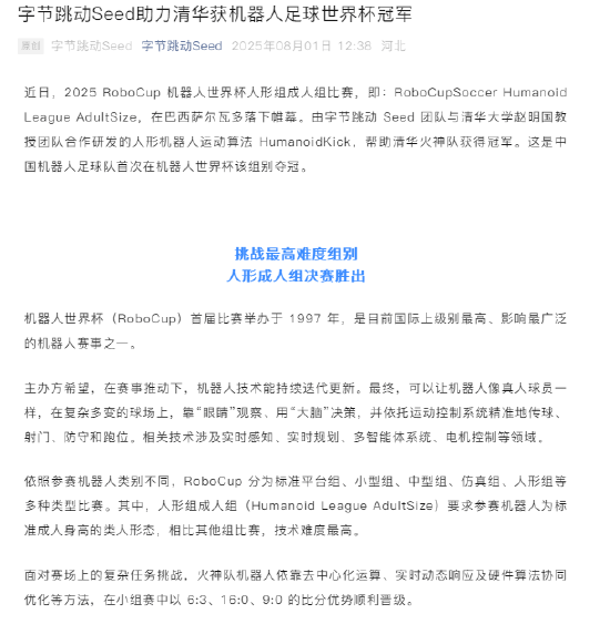 8月1日消息,据字节跳动Seed,近日,2025 RoboCup 机器人世界杯人形组成人组比赛,即:RoboCupSoccer Humanoid League AdultSize,在巴西萨尔瓦多落下帷幕。由字节跳动 Seed 团队与清华大学赵明国教授团队合作研发的人形机器人运动算法 HumanoidKick,帮助清华火神队获得冠军。这是中国机器人足球队首次在机器人世界杯该组别夺冠。