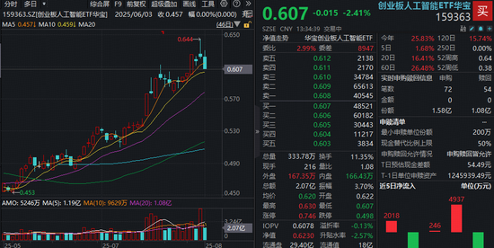 热门ETF方面,同标的指数规模最大、流动性突出的创业板人工智能ETF(159363)午后跌幅扩大,场内价格跌超2%回踩五日线,实时成交额超2亿元,资金逢跌净申购5000万份!