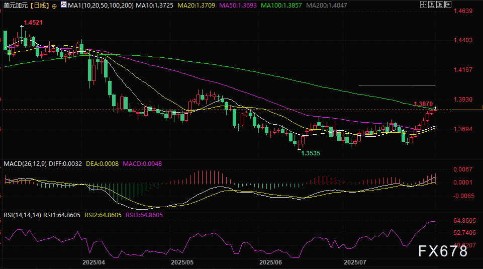 汇通财经APP讯——周五(8月1日)亚洲时段,美元兑加元冲高回落,一度刷新5月22日以来新高至1.3869,目前小幅回落至1.3850附近,此前汇价已经连续六个交易日上涨。美国总统唐纳德·特朗普意外将加拿大关税提高至35%,叠加美联储鹰派发言驱动,推动美元兑加元冲高。加拿大标普/TSX综合指数周四收跌0.4%,收报27259.78,维持上升通道运行。