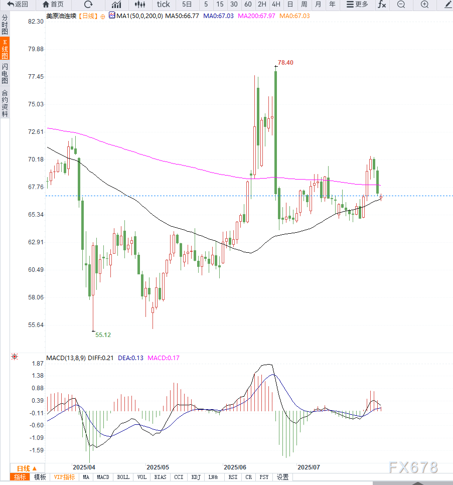 从技术面来看,美原油(WTI)日线图显示价格跌破关键支撑位70美元,延续短期下行通道。当前K线连续两日收阴,MACD快慢线呈死叉发散,显示空头力量主导市场;