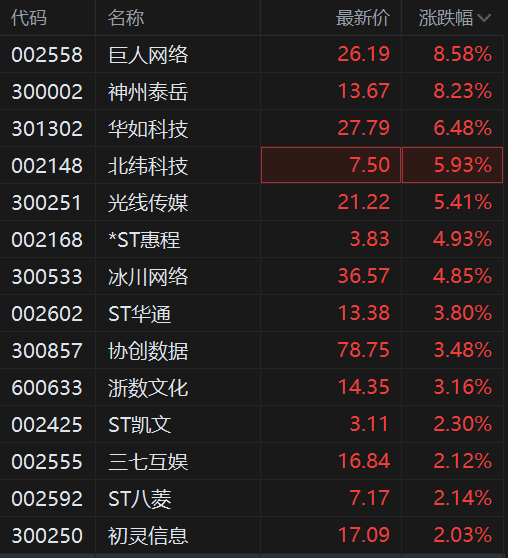 A股网络游戏股集体拉升,其中,巨人网络、神州泰岳涨超8%,华如科技涨6.5%,北纬科技涨5%,冰川网络、浙数文化、三七互娱、初灵信息均涨超2%。