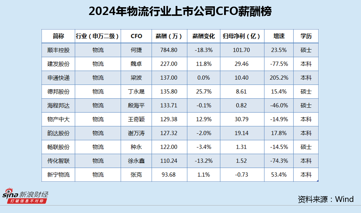 行业内,顺丰控股CFO何捷年内降薪176万,仍以784.8万元年薪登顶,高于第二名建发股份CFO魏卓550多万元,超同行平均薪酬6.5倍,日薪高达2.15万元。