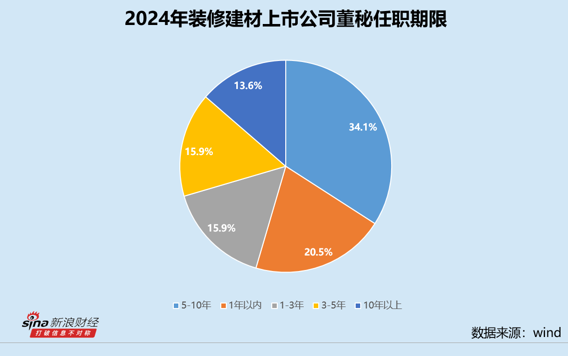 就任职期限而言,2024年装修建材上市公司董秘以中长期为主,任职时间在5-10年的占比最高,约为34.1%;任期在1年以内的董秘群体次之,约占比20.5%;任职1-3年和3-5年的董秘群体均占比15.9%,有6位董秘在岗位坚守超10年。任职时间最长的是伟星新材谭梅,她自2007年12月开始担任董事会秘书一职,至今已接近18年。