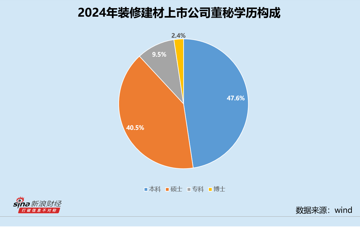 就学历构成而言,剔除未披露具体信息的中铁装配和瑞泰科技,在余下的42位装修建材上市公司董秘中,本科学历约占47.6%,硕士和专科学历则分别占比40.5%、9.5%,顾地科技张东峰最高学历为博士。