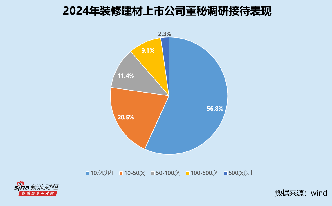 2024年,装修建材上市公司接待调研未超过10次的董秘群体约占56.8%,三棵树米粒、亚士创能蔡永刚和凯伦股份(维权)霍巨的接待次数为零。接待10-50次、50-100次、100-500次的董秘分别占比20.5%、11.4%、9.1%,伟星新材谭梅全年接待713次,平均每个工作日接待2-3次。
