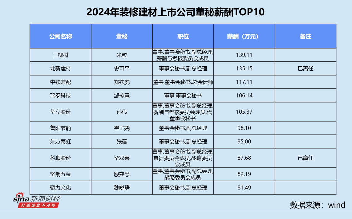 三棵树米粒以139.11万元薪酬稳坐第一,比第二名北新建材史可平高约4万元。财报显示,米粒自2017年开始担任董事会秘书职务,同时是公司的副总经理。薪酬最低且任职一年以上的董秘为科创新材李青,报告期内从公司获得报酬总额仅为12.12万元,较2023年微增3.1%,期末未持有公司股份。