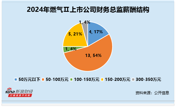 分行业来看,公用事业-燃气II行业(申万二级行业)上市公司财务总监CFO 2024年薪酬平均数约为98.98万元。其中薪酬最高为大众公用蒋贇,2024年薪酬高达302.8万元;薪酬最低为胜通能源宋海贞,2024年薪酬为29.77万元(统计剔除了未完整领取2024年全年薪酬的财务总监CFO)。从整体薪酬分布来看,薪酬在50-100万元人数最多,共计13人,占比54%。