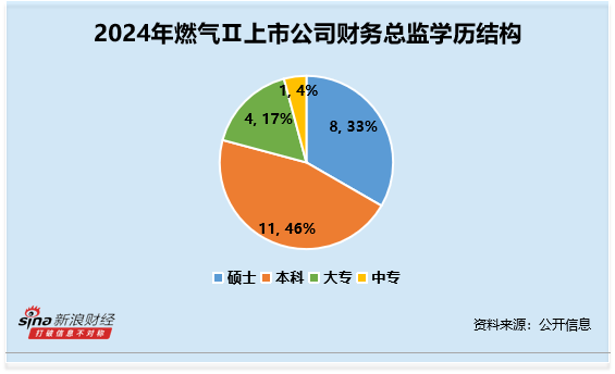 从年龄结构来看,财务总监CFO的年龄平均数约为50.17岁,其中40-49岁最多,人数共12人,占比约50%。其中,年龄最大的为皖天然气朱亦洪,57岁,学历为硕士,2024年薪酬为72.29万元;年龄最小的为美能能源吴兰,39岁,学历为本科,2024年薪酬为41.03万元。