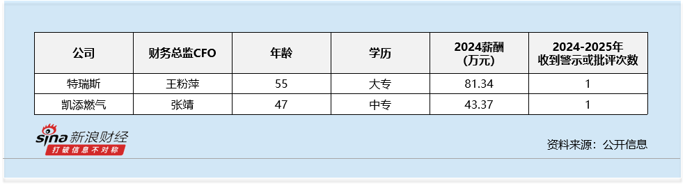 凯添燃气张靖收到警示函1次,其2024年薪酬43.37万元。其违规事项为包括在2023年年报中称财务人员未在控股股东控制的其他企业兼职,实际有部分财务人员兼职;遗漏披露某业务模式的收入确认原则;未合并披露实际控制人为夫妻关系的供应商。此外,公司2024年年度权益分派方案经董事会、股东大会审议通过后,未及时完成内幕信息知情人登记与档案报送。