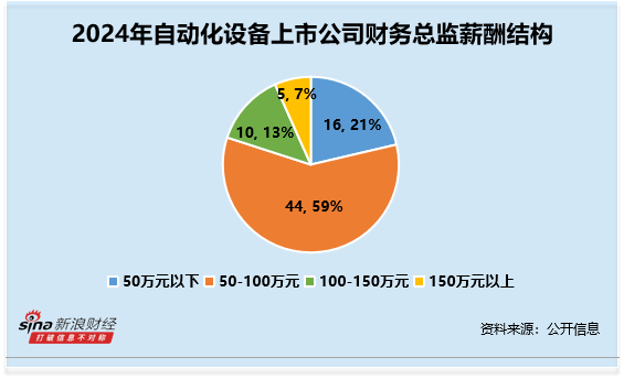 分行业来看,机械设备-自动化设备行业(申万二级行业)上市公司财务总监CFO 2024年薪酬平均数约为77.97万元。其中薪酬最高为华工科技王霞,2024年薪酬高达236.55万元;薪酬最低为欧克科技陈真,2024年薪酬为15.25万元(统计剔除了未完整领取2024年全年薪酬的财务总监CFO)。从整体薪酬分布来看,薪酬在50-100万元人数最多,共计44人,占比59%。