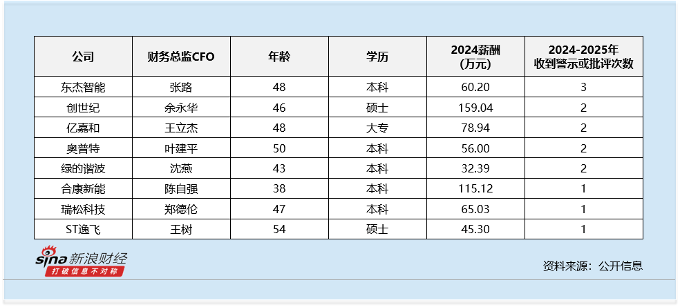 从违规情况来看,行业内共有8名财务总监CFO在2024-2025年收到过警示函、公开通报或内部通报的情况。