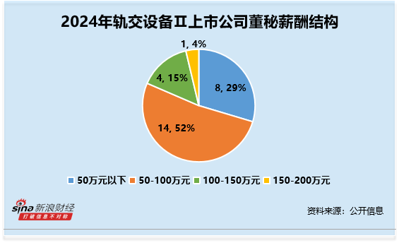 分行业来看,机械设备-轨交设备Ⅱ行业(申万二级行业)上市公司董秘2024年薪酬平均数约为72.73万元。其中薪酬最高为康尼机电陈磊,大专学历,2024年薪酬高达159.40万元;薪酬最低为工大高科胡梦慧,2024年薪酬为24.93万元(统计剔除了未完整领取2024年全年薪酬的董秘)。从整体薪酬分布来看,薪酬在50-100万元人数最多,共计14人,占比52%。