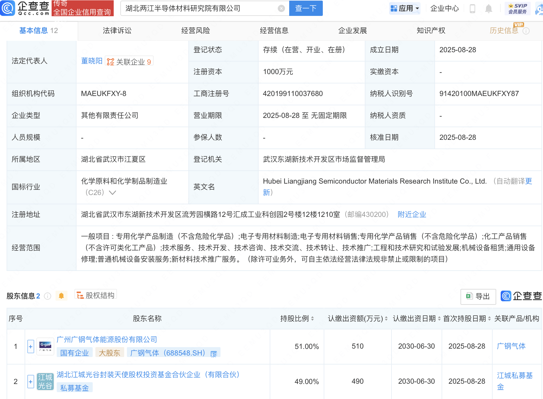 企查查APP显示,近日,湖北两江半导体材料研究院有限公司成立,注册资本1000万元,经营范围包含:电子专用材料制造;电子专用材料销售;专用化学产品销售(不含危险化学品)等。企查查股权穿透显示,该公司由广钢气体(688548)等共同持股。