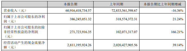 中国经济网北京9月2日讯 东方盛虹(000301.SZ)近日披露的2025年半年度报告显示,公司上半年实现营业收入609.16亿元,同比下降16.36%;归属于上市公司股东的净利润3.86亿元,同比增长21.24%;归属于上市公司股东的扣除非经常性损益的净利润2.72亿元,同比增长166.21%;经营活动产生的现金流量净额28.11亿元,同比增长39.14%。