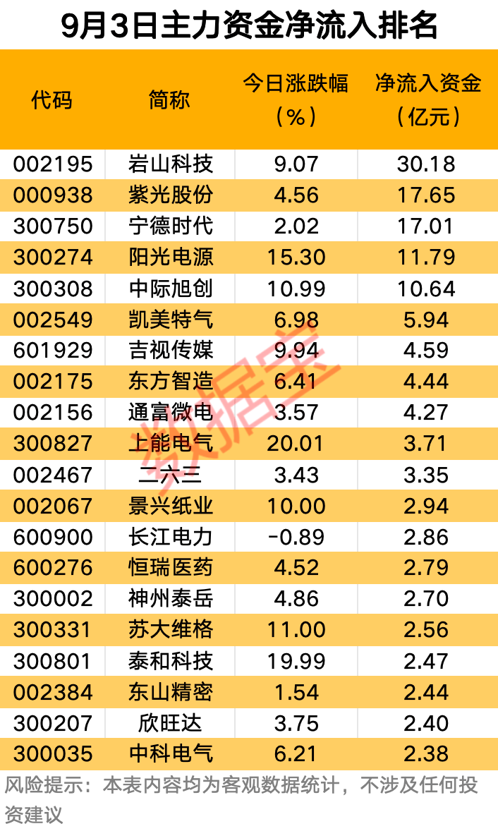岩山科技主力资金净流入30.18亿元,居首。从龙虎榜数据来看,上榜营业部席位全天成交30.44亿元,合计净买入6.39亿元。具体来看,深股通专用、国泰海通证券(600837)南京太平南路证券营业部分别净买入2.8亿元、3.5亿元。