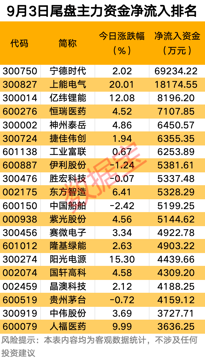 个股方面,宁德时代(300750)、上能电气尾盘获主力资金净流入均超1亿元。宁德时代尾盘主力资金净流入6.92亿元。消息面上,近期,受益于储能电池的需求猛增,头部锂电企业“满产满销”,产能供不应求。