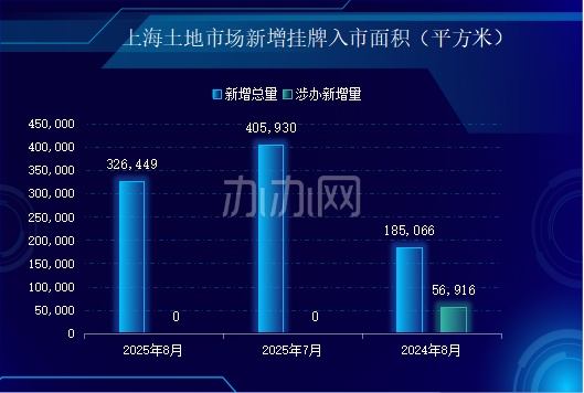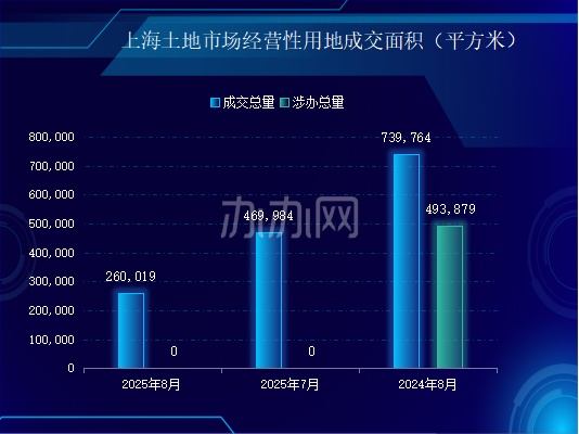 办办网数据显示8月份上海土地市场供应端延续收缩态势,无论是新增挂牌面积还是起拍总价,环比均出现显著下滑。在工业用地支撑大局的同时,办公用地供应再度“归零”,与去年同期相比,结构差异巨大。