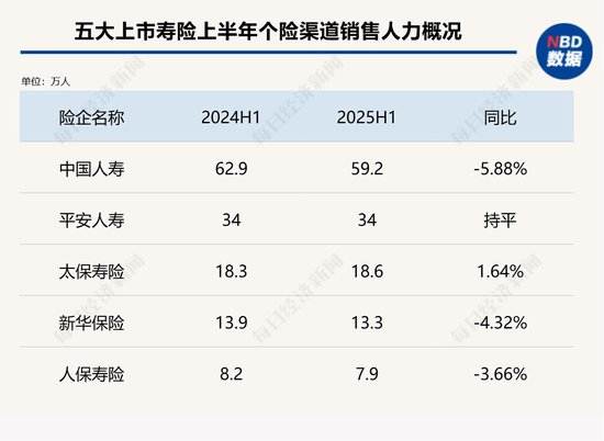 具体来看,上半年,中国人寿个险销售人力为59.2万人,较去年同期的62.9万人同比下滑5.89%;平安寿险个人寿险销售代理人数量为34万人,与去年同期基本持平;太保寿险月均保险营销员18.3万人,期末保险营销员18.6万人,同比增长1.6%;人保寿险营销员规模人力7.9万人,较去年同期的8.2万人下滑3.66%;新华保险个险代理人规模人力13.3万人,较去年同期下滑4.3%。