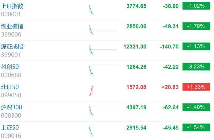 A股三大指数走低,沪指、深证成指跌超1%,创业板指跌1.5%,科创50指数跌近3%,CPO、银行、军工、半导体领跌!1700股下跌