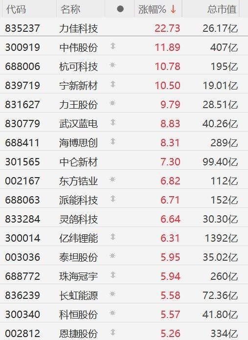 格隆汇9月4日|A股市场固态电池概念股集体走强,其中,力佳科技找那个超22%,中伟股份涨超11%,杭可科技(688006)、宁新新材涨超10%,力王股份涨近10%,武汉蓝电、海博思创涨超8%,中仑新材涨超7%,东方锆业(002167)、派能科技、灵鸽科技、亿纬锂能(300014)涨超6%,恩捷股份(002812)、科恒股份(300340)、长虹能源、珠海冠宇、泰坦股份涨超5%。