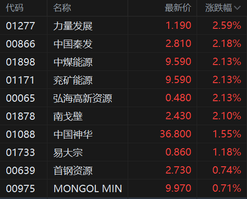 港股煤炭股普涨上涨,其中,力量发展涨2.6%,中国秦发、兖矿能源、中煤能源、南戈壁涨超2%,中国神华涨1.5%,易大宗涨超1%,首钢资源跟涨。