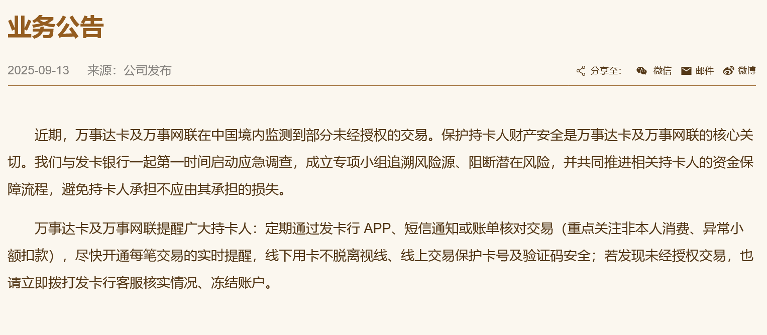 9月13日金融一线消息,万事网联今日发布公告称,近期,万事达卡及万事网联在中国境内监测到部分未经授权的交易。保护持卡人财产安全是万事达卡及万事网联的核心关切。我们与发卡银行一起第一时间启动应急调查,成立专项小组追溯风险源、阻断潜在风险,并共同推进相关持卡人的资金保障流程,避免持卡人承担不应由其承担的损失。
