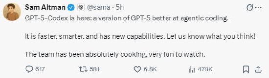 OpenAI首席执行官萨姆·奥特曼在社交平台X上发帖称:“GPT-5-Codex来了:一个更擅长代理编码的GPT-5版本。它更快,更智能,并具有新的功能。让我们知道你的想法!”