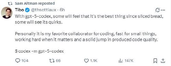 奥特曼还转发了一位用户的评论:“有了gpt-5-codex,有些人会觉得它是自切片面包以来最好的东西,有些人会看到它的怪癖。就我个人而言,它是我最喜欢的编码合作者,对小事情处理迅速,在重要的时候努力工作,并且在生成的代码质量上有坚实的飞跃。”