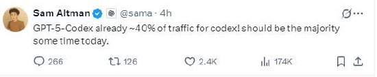 奥特曼晚些时候在另一条帖子中说:“GPT-5-Codex已经占到codex流量的40% !今天某个时候应该能占到多数。”