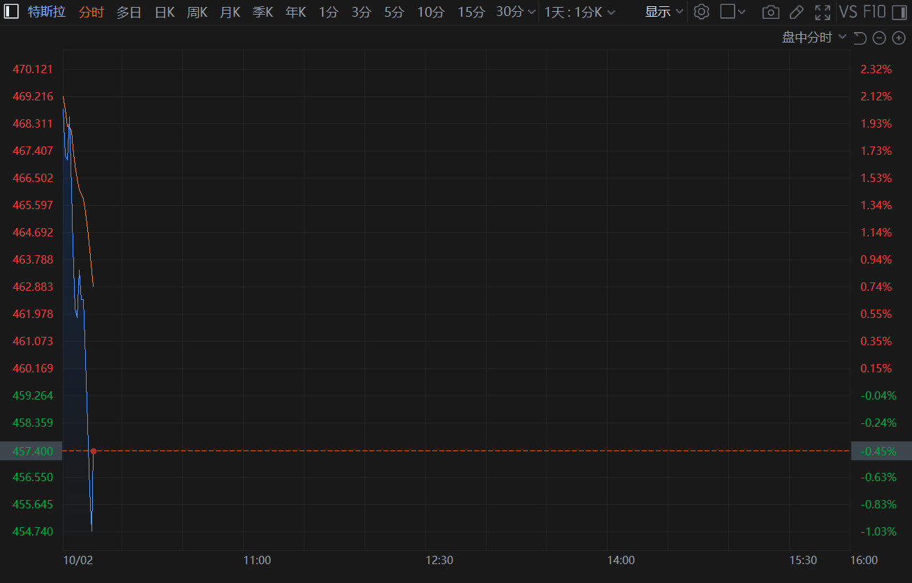 特斯拉(TSLA.US)短线下挫,日内转跌,此前一度涨超2%。特斯拉第三季度交付量497099,同比+7.4%,预估439612。Model 3/Y 交付量481166辆,同比+9.4%,预估424828。汽车产量447450辆,同比-4.8%,预估450313。Model 3/Y 产量435826辆,同比-1.8%,预估426714。