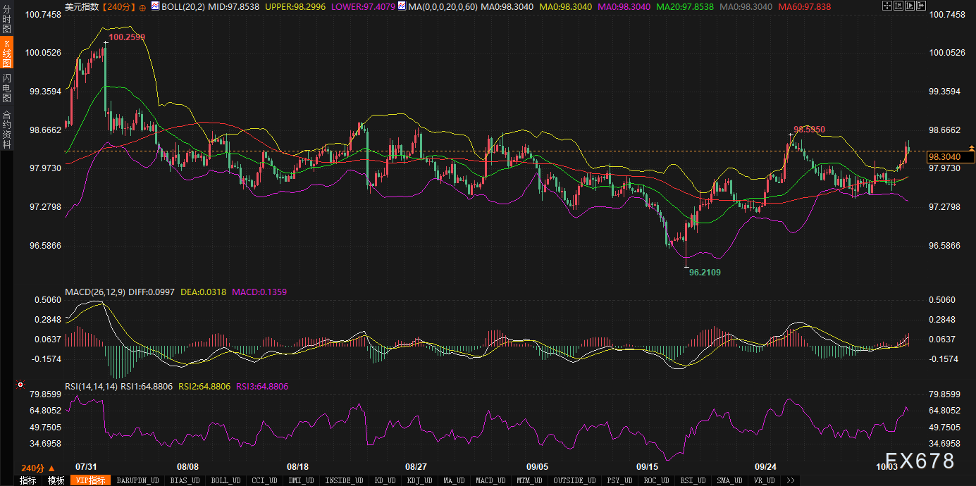 技术面则为这一基本面叙事提供了坚实的图表佐证。在240分钟周期上,美元指数的结构已明确转向多头主导。自9月24日低点反弹以来,价格沿布林带上轨运行,K线实体稳居中轨97.8538之上,近期中轨与下轨的轻微上扬,标志着市场从弱势震荡向偏多转换。动能指标同样亮眼:MACD双线保持多头排列,DIFF虽暂落后于DEA,但柱状图已从负值翻转为正,并持续放大,释放出积累已久的买盘能量。RSI读数64.8052,稳居50轴以上,接近但未触及70的超买门槛,暗示上行空间尚存。这一强势模式,符合经典的“突破上轨延续”模板,价格位于所有关键均线之上,短期结构完整无缺。