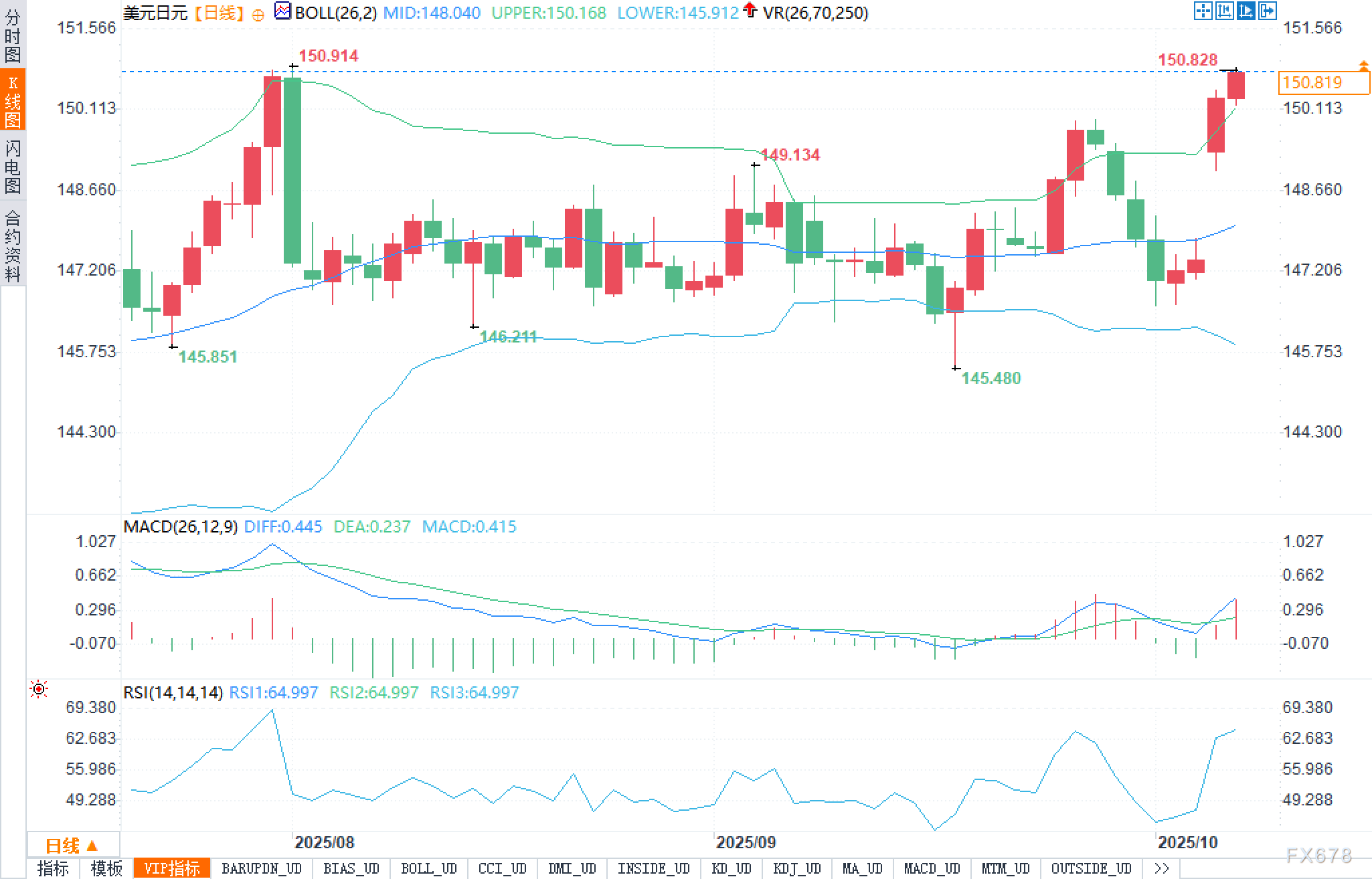 从日线图看,多头占优且进入“上轨外延伸”阶段。布林带中轨148.040,上轨150.168,下轨145.912;当前价已显著站上上轨,属于“趋势加速”形态,但亦提高了短线回撤概率。前高150.914构成上方阻力;若日线收于其之上并连续两日有效站稳,可视为一次“量能突破”的确认,否则容易演化为“假突破―回测上轨”的常见路径。