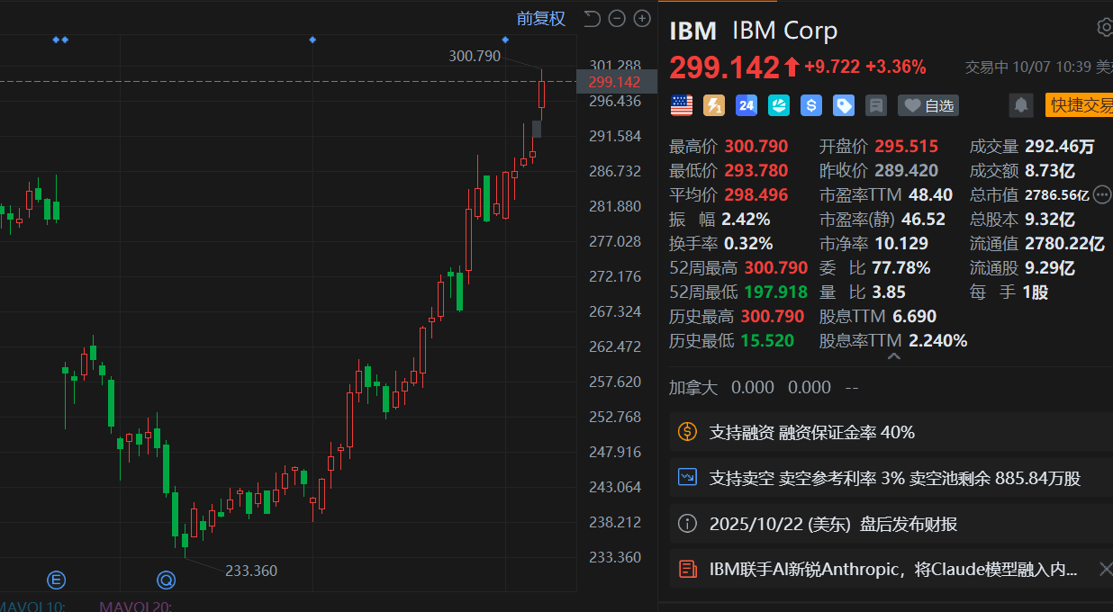 IBM(IBM.US)盘中涨4%,报300.79美元创历史新高。消息上,IBM Corp宣布与Anthropic达成深度合作,将后者大型语言模型Claude系列集成至精选内部及外部开发工具与企业产品中,旨在为IBM客户提升生产力。此外,IBM计划通过即将推出的watsonx Assistant for Z将功能扩展至大型机,专用Z代理将通过理解对话上下文与自动化流程,在保障安全合规的前提下推动系统管理从被动故障排除向主动模式转型。