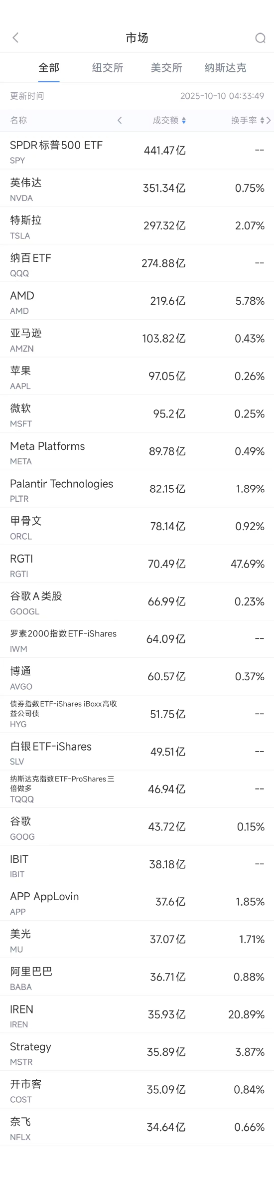 第3名AMD收跌1.13%,成交219.6亿美元。此前该股已经连续三个交易日上涨,累计涨幅达43%。该公司CEO确认Instinct MI450 GPU细节,称该显卡加速器将采用2nm先进制程工艺,此举标志着AMD在高性能计算硬件领域的技术研发再获新进展。