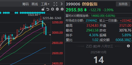 10月14日,市场全天震荡调整,创业板指、科创50指数盘中双双跌超4%。截至收盘,沪指跌0.62%,深成指跌2.54%,创业板指跌3.99%。