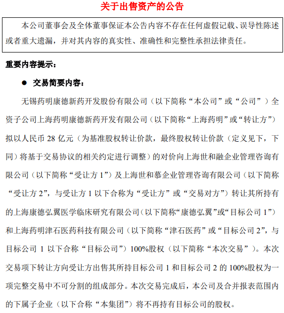 交易详情为,上海药明向上海世和融企业管理咨询有限公司及上海世和慕企业管理咨询有限公司转让其持有的上海康德弘翼医学临床研究有限公司(以下简称康德弘翼)和上海药明津石医药科技有限公司(以下简称津石医药)100%股权。