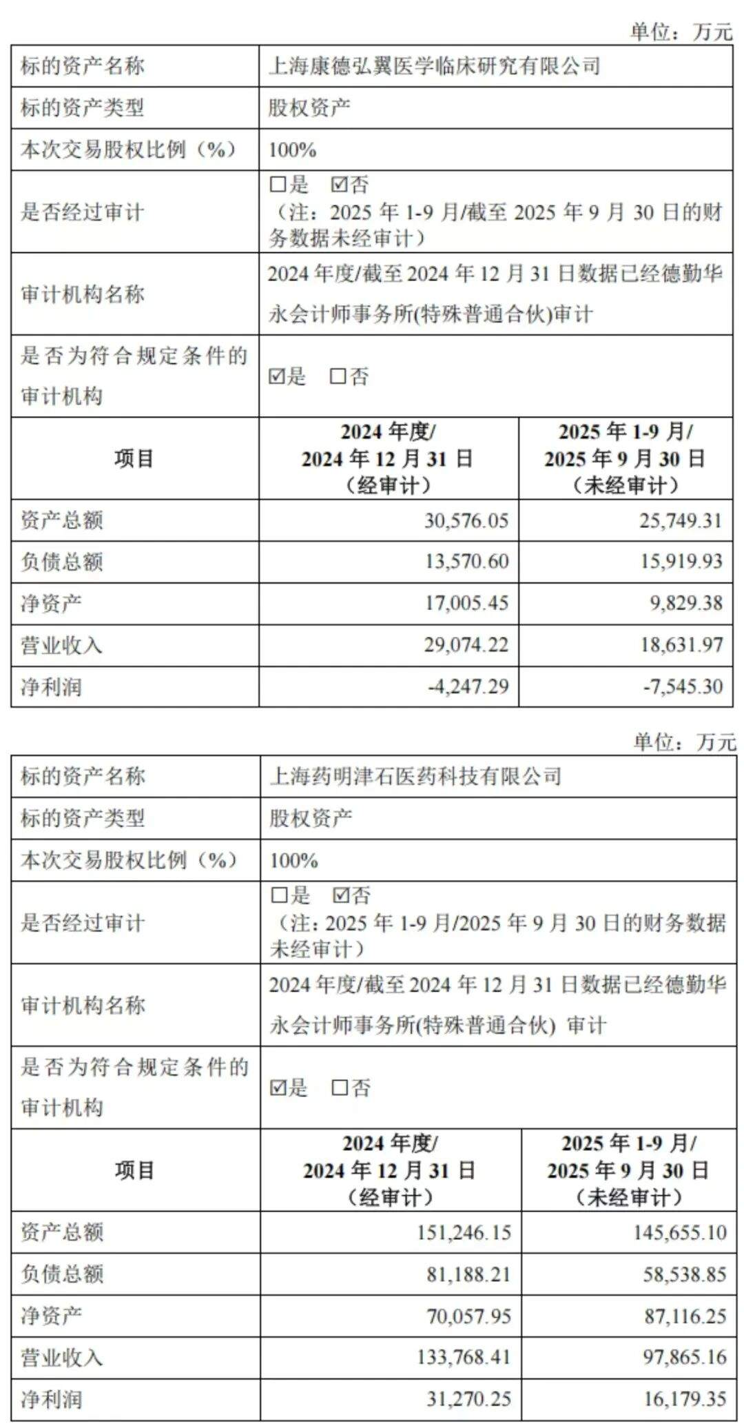 公告显示,津石医药及康德弘翼主要经营临床研究服务业务。截至2025年9月末,康德弘翼、津石医药的资产总额分别为2.57亿元、14.57亿元,净资产分别为9829.38万元、8.71亿元。