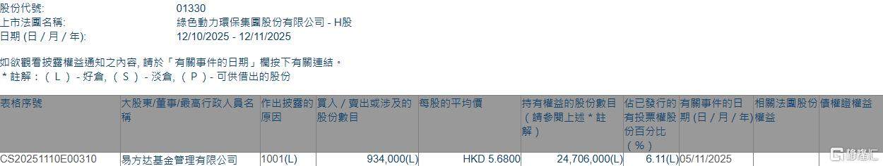 格隆汇11月12日丨根据联交所最新权益披露资料显示,2025年11月5日,绿色动力环保(01330.HK)获易方达基金管理有限公司在场内以每股均价5.68港元增持93.4万股,涉资约530.51万港元。