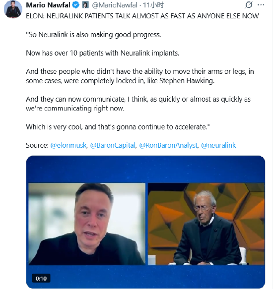 一位网友在X上转发马斯克最近接受罗恩·巴伦采访的视频片段。马斯克在采访中说:“所以Neuralink也在取得良好的进展。目前已有超过10名患者接受了Neuralink的植入。而那些无法移动手臂或双腿的人,在某些情况下,会完全处于‘封闭状态’,就像斯蒂芬·霍金那样。而他们现在能够进行的交流速度,我认为和我们现在交流的速度一样快,或者差不多一样快。这真是太酷了,而且这种趋势还将继续加速。”