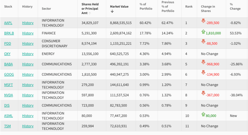 截至三季度末,H&H 基金的前十大重仓股分别为苹果、伯克希尔B、拼多多、西方石油、阿里巴巴、谷歌、微软、英伟达、迪士尼、阿斯麦。其中,苹果仍然是第一大重仓,经历连续四个季度减持后,期末持股市值仍高达89亿美元,占总仓位的60%。