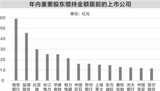 从单家公司看,今年以来增持金额超10亿元的公司有17家,6家公司增持金额超过25亿元,位居榜首的是南京银行(601009),其他还有盐湖股份、比亚迪(002594)、长江电力(600900)、华菱钢铁(000932)等。